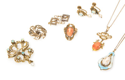 consisting of a 14 karat yellow gold ring containing a carved coral cameo and one old European cut diamond, a pair of earrings containing two cabochon cut opals and two cultured pearls, a spiral brooch containing numerous seed pearls and a single cut diamond, a 14 karat yellow gold brooch containing numerous seed pearls and one old mine cut diamond, a 14 karat yellow gold curvilinear pendant brooch containing seven cabochon cut opals and seed pearls, a 10 karat yellow gold pendant containing numerous seed pearls and a carved coral cameo suspended from a chain, together with a goldtone pendant with polychrome enamel, suspended from a chain.