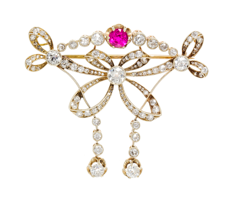 containing 133 old European, old mine and single cut diamonds weighing approximately 4.86 carats total and one round cut synthetic ruby measuring 6.11 x 6.13 x 3.89 mm.