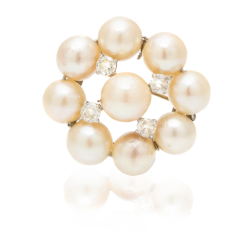 in an open circular design, containing nine pearls (origin not tested) measuring approximately 7.30-8.42 mm in diameter and four transitional brilliant cut diamonds weighing approximately 0.50 carat total, white gold brooch fittings.