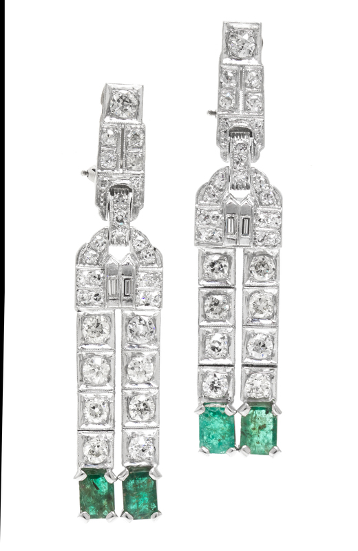 A Pair of Platinum, Diamond and Emerald Earrings,
