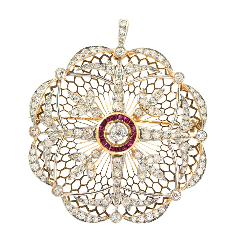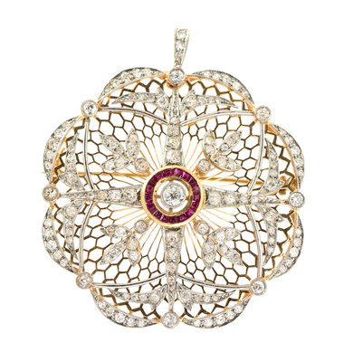 consisting of a platinum openwork design overlaid on an intricate gold honeycomb motif ground, containing one old European cut diamond weighing approximately 0.16 carat, 17 calibre cut rubies weighing approximately 0.34 carat total and 107 old mine, old European and single cut diamonds weighing approximately 4.67 carats total, hinged bail allows wear as pendant.
