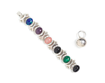 consisting of a bracelet containing oval cabochon cut onyx, malachite, rose quartz, amethyst and hardstone, together with a silver ball ring.Bracelet stamp: Mexico TN-86 925.Ring: Mexico MB (Eagle 5).