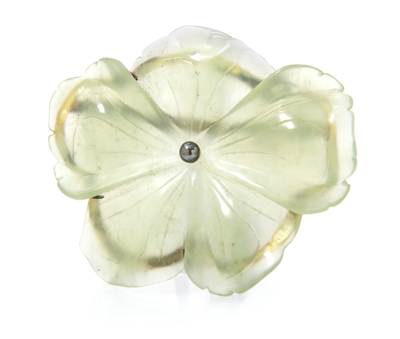 consisting of a semi-transparent carved and pierced pale yellowish green hardstone depicting a five petal flower within a claw prong setting, brooch measures approximately 79.00 x 66.00 mm.Stamp: 925.