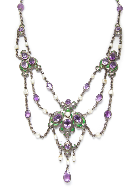 A Silver, Amethyst, Pearl and Enamel Swag Necklace,