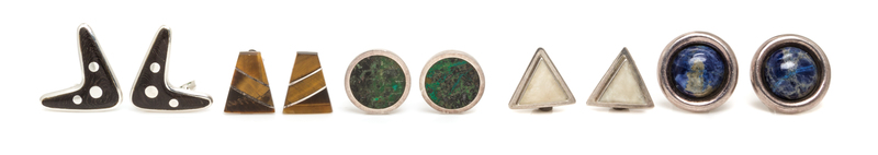 consisting of a pair of round earclips with two round cabochon cut sodalite, a pair of earclips with tiger's eye inlay, a pair of triangular earclips with white hardstone, a pair of round earclips with green hardstone inlay, together with a pair of earclips with wood inlay.