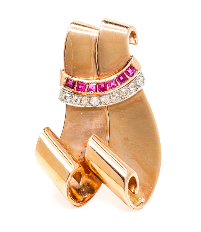 A Retro Rose Gold, Ruby and Diamond Dress Clip Brooch,