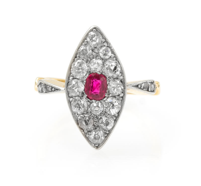 containing one rectangular cushion cut synthetic ruby weighing approximately 0.30 carat, 14 old European and single cut diamonds weighing approximately 0.75 carat total and four rose cut diamonds.