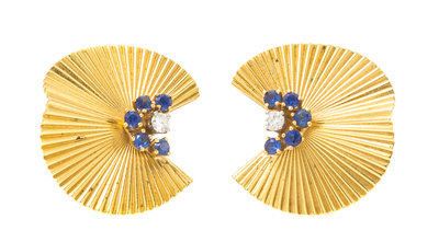 A Pair of Retro 18 Karat Yellow Gold, Diamond and Sapphire Earclips,