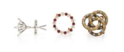 consisting of an 18 karat white gold pendant enhancer containing one marquise shape brilliant cut diamond weighing approximately 0.13 carat, seven round brilliant cut diamonds weighing approximately 0.28 carat total and five straight baguette cut diamonds weighing approximately 0.32 carat total, a gold tone and enamel brooch in a floral motif with three interlocking rings, and one rose gold circle brooch containing nine round mixed cut rubies and 18 round seed pearls.