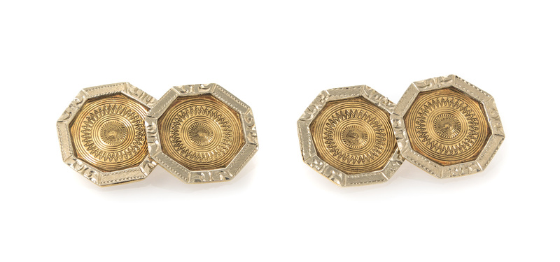 of octagonal design, the gold centers in a guilloche design within the raised textured platinum borders.