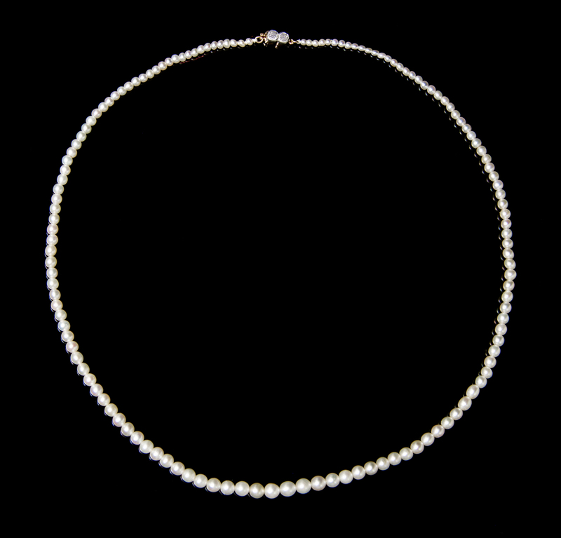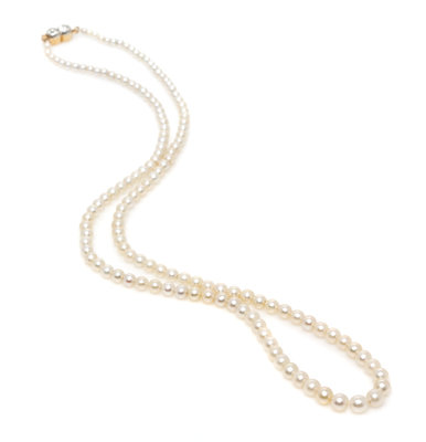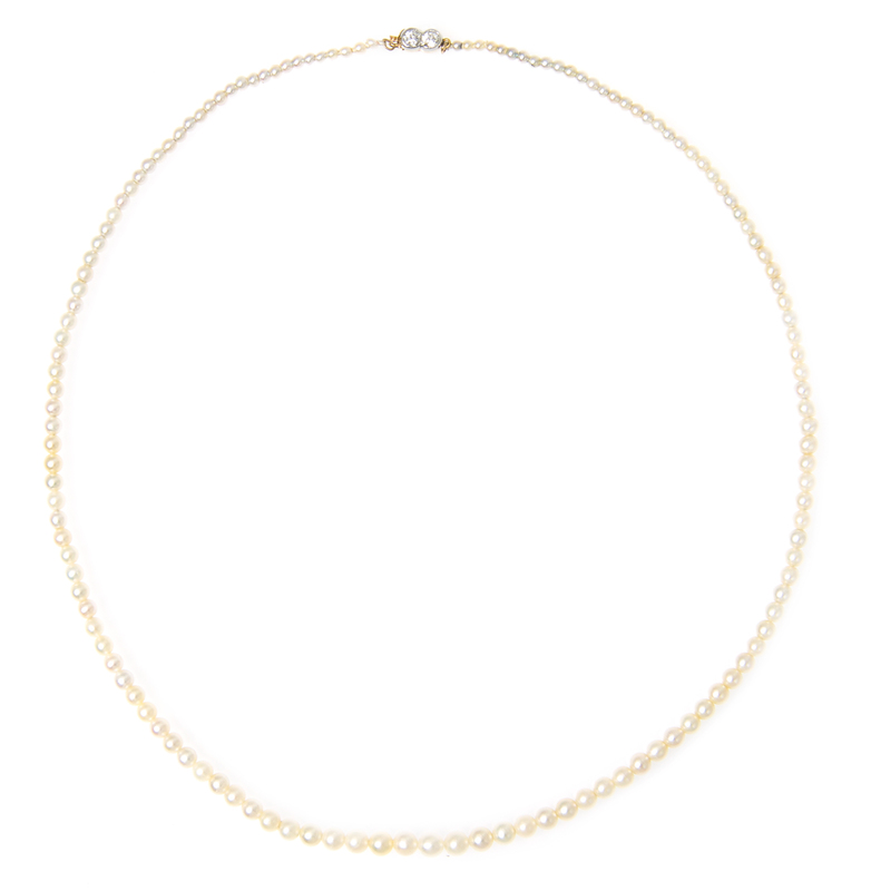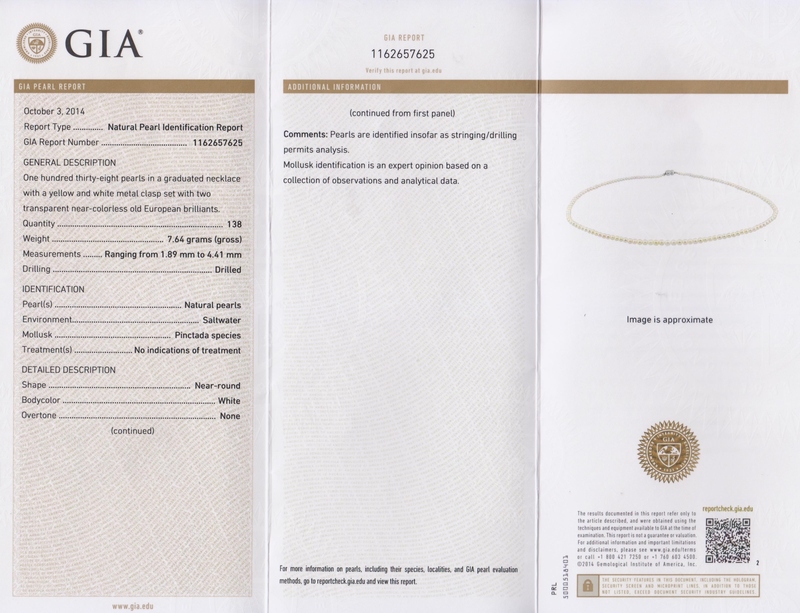 consisting of 138 pearls measuring approximately 1.89-4.41 mm in diameter strung knotted with a platinum topped gold clasp containing two old European cut diamonds weighing approximately 0.20 carat total.Accompanied by a Gemological Institute of America pearl identification certificate number 1162657625, dated October 3, 2014, stating Pearls: Predominantly Natural, Environment: Saltwater, Species Pinctada, Treatment: No indications of treatment, Shape: Near Round, Bodycolor: White, Overtone: None.