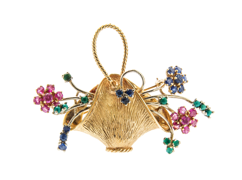 A 14 Karat Yellow Gold, Sapphire, Ruby, Emerald and Turquoise Flower Basket Brooch,
