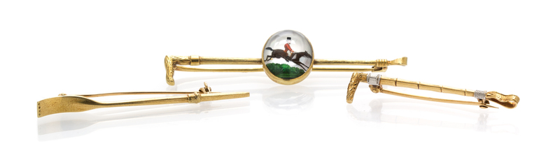 consisting of one riding crop brooch with a fox hunt Essex crystal, one riding crop brooch and one boat oar brooch.Boat oar stamp: 14K.Fox hunt brooch scratch mark: B-74.Riding crop brooch scratch mark: ZZ-889.