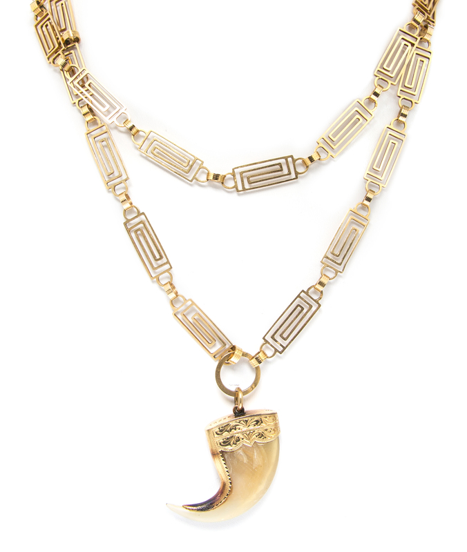 An 18 Karat Yellow Gold Greek Key Motif Longchain, French, With 18 Karat Yellow Gold and Tiger Claw Pendant,