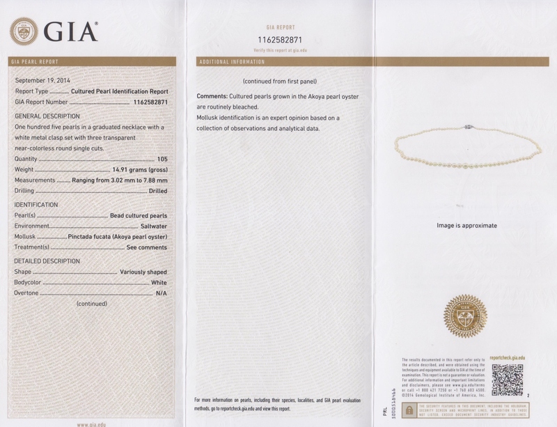 containing 105 pearls measuring approximately 3.02-7.88 mm in diameter strung knotted with a platinum clasp containing three single cut diamonds.Stamp: PLAT.Accompanied by a Gemological Institute of America pearl identification certificate number 1162582871, dated September 19, 2014, stating Pearls: Bead cultured, Environment: Saltwater, Mollusk: Pinctada fucata species, Shape: Variously shaped, Bodycolor: White.
