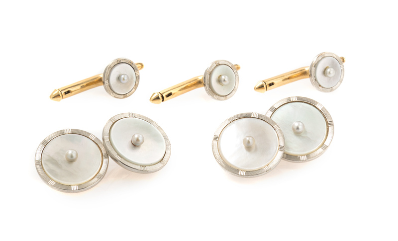 consisting of a pair of cufflinks with mother-of-pearl centers and four round seed pearls measuring approximately 2.25-2.34 mm in diameter and three dress buttons with mother-of-pearl centers and three round seed pearls measuring approximately 2.25-2.34 mm in diameter.Stamp: 14K.