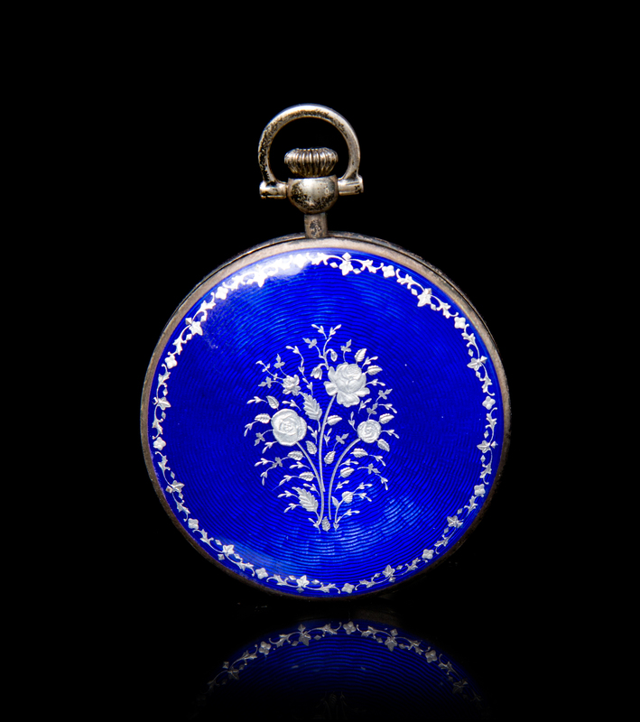 42.00 mm case diameter, porcelain dial, Roman numerals, blued steel moon hands, blue guilloche enamel case and case back with silver foil accents in a foliate motif, coin edge bezel, manual wind mechanical movement.Inner case back stamp: COMOR WATCH SWISS 925.