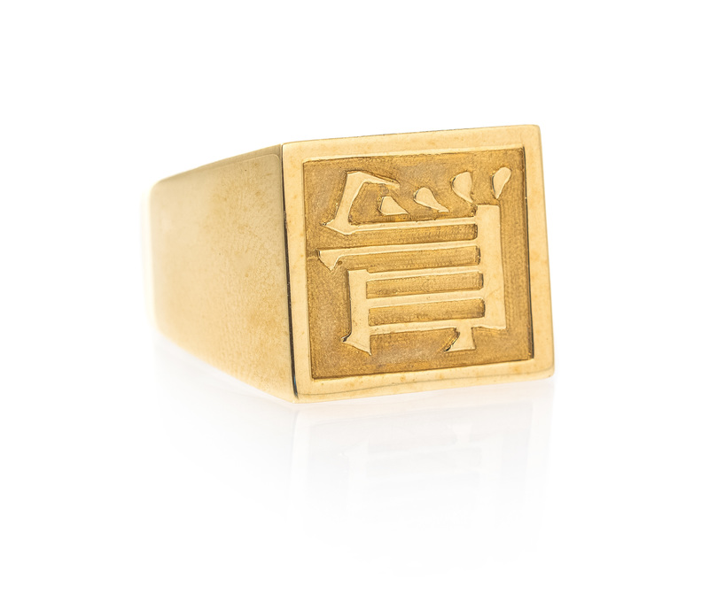 the center featuring a square seal accented with a raised Asian character. Stamp: 14.