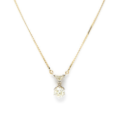 consisting of one triangular step cut diamond weighing approximately 0.36 carat and one old European cut diamond weighing approximately 1.02 carats, suspended on a yellow gold flat snake chain. Stamp: 14K ITALY.