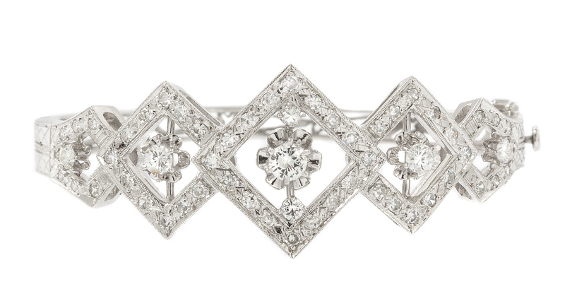 A 14 Karat White Gold and Diamond Hinged Bangle Bracelet,
