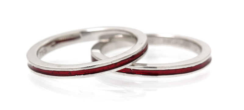 A Pair of 18 Karat White Gold and Red Enamel Rings, Hidalgo.