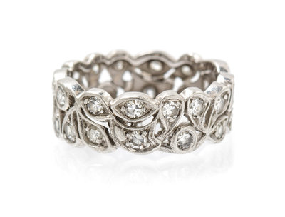 openwork design with millegrain edge in foliage motif containing 28 round single cut diamonds weighing approximately 1.04 carats total.