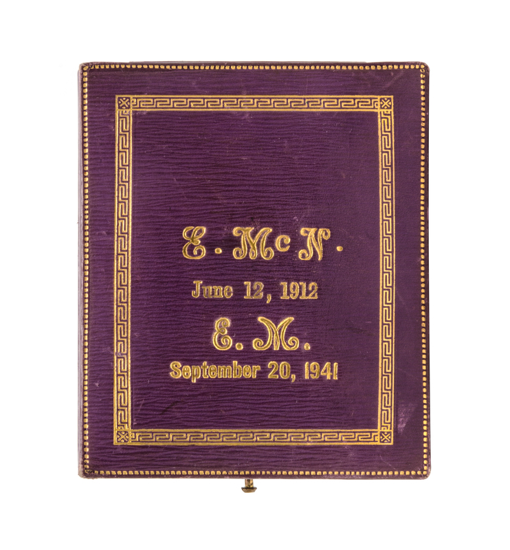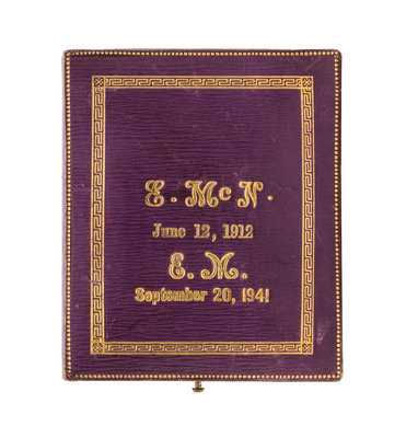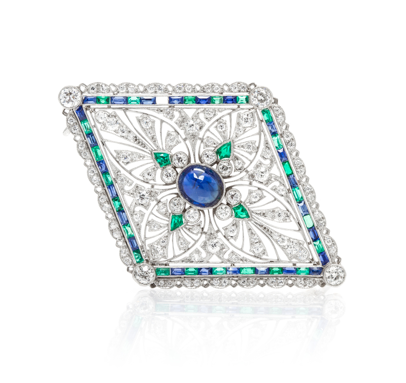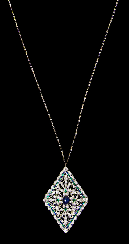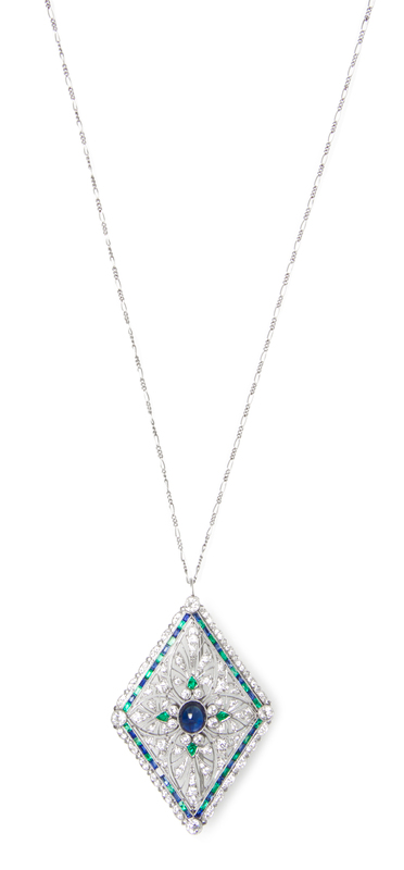 of lozenge form, centered around an oval cabochon cut sapphire measuring approximately 7.50 x 6.40 x 3.97 mm within a bezel with millegrain edgework surrounded by an intricate openwork foliate motif containing four shield cut emeralds and numerous old European cut diamonds weighing approximately 0.80 carat total, the inner border channel set with alternating rectangular calibre cut sapphires and emeralds, the outer fringe containing four old European cut diamonds at the compass points weighing approximately 0.48 carat total and 48 old European cut diamonds weighing approximately 0.33 carat total, double gallery, detachable brooch fitting, collapsible bail allows wear as pendant, together with a platinum chain.Hand inscribed: TIFFANY & Co. (scratch mark 1239).Accompanied by an original case signed TIFFANY & CO. NEW YORK PARIS LONDON. The case has been personalized with gold leaf lettering noting the original presentation of the pendant to Elizabeth McNairy on the occasion of her marriage to Francis Adair Monroe Jr. from Mr. and Mrs. Philip A. Rollins of New York in 1912, followed by the passing down of the pendant in 1941 upon the marriage of Elizabeth Monroe to Fitzhugh Willets Boggs.