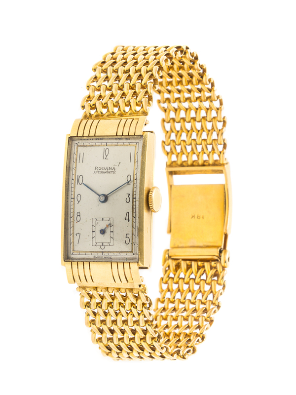 36.00 x 20.00 mm case dimensions, silvered dial signed RODANA, painted Arabic numerals, subdial for seconds at 6 o'clock, blued steel stick hands, rectangular case, hooded lugs, hinged case back, manual wind 15 jewel movement signed RODANA, later 18 karat yellow gold mesh link bracelet, box clasp.