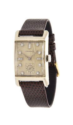 40.00 x 24.00 mm case dimensions including lugs, matte gold dial signed LONGINES, applied block and dot numerals set with single cut diamonds, silvered baton hands, subdial for seconds at 6 o'clock, polished rectangular case with beveled sides and flared lugs, snap in case back, manual wind 17 jewel movement, brown strap, gold tone buckle.Stamp: K&E 14K.