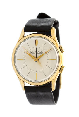34.00 mm case diameter, silvered dial signed Paul Buhre, applied gilt and painted baton numerals, luminous gilt dauphine hands with center seconds hand and black baton hand for alarm function, outer band has crown at 4 o'clock for winding and time setting with another crown at 2 o'clock for alarm function winding and setting, circular case, concave lugs, steel case back affixed with an o-ring, black leather strap, gold tone buckle.