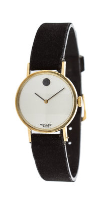 24.00 mm case diameter, matte silvered dial, black dot numeral at 12 o'clock, baton hands, black dot numeral at 12 o'clock, pencil hands, coin edge crown with Movado insignia, snap on case back, manual wind mechanical movement, black suede strap, black buckle.Stamp: 14K (makers mark for Movado).