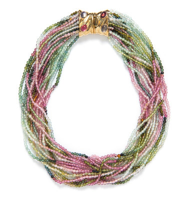 consisting of 15 strands of round multicolored tourmaline and quartz beads measuring approximately 2.45-3.15 mm in diameter, strung knotted with a 14 karat yellow gold clasp containing two oval cabochon cut pink tourmaline and two oval cabochon cut amethyst.Stamp: 14K 585.