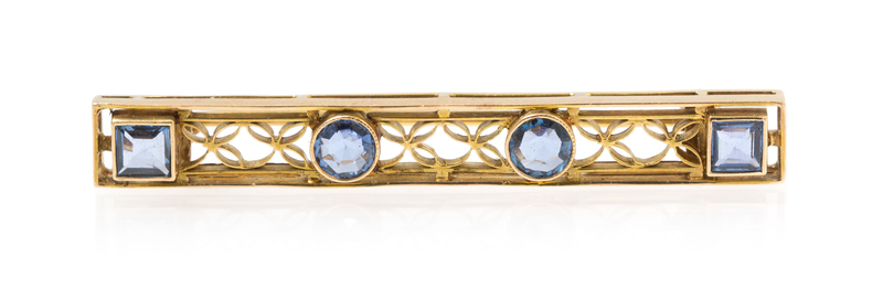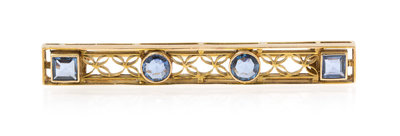 in an elongated rectangular form accented with interlocking filigree detail, containing two bezel set round mixed cut sapphires and two bezel set square step cut sapphires.