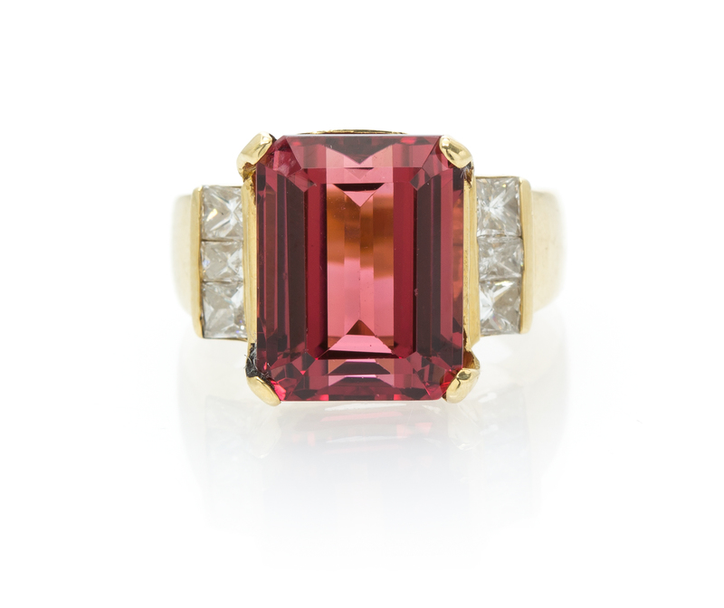containing one octagonal step cut rubellite tourmaline measuring approximately 13.01 x 10.12 x 7.24 mm and six princess cut diamonds weighing approximately 0.42 carat total.Stamp: 14K.