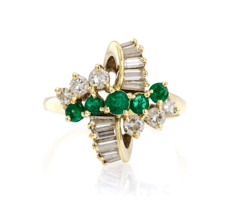 containing five round mixed cut emeralds, 10 baguette cut diamonds weighing approximately 0.42 carat total and six round brilliant cut diamonds weighing approximately 0.34 carat total.Stamp: WENDY 14K.