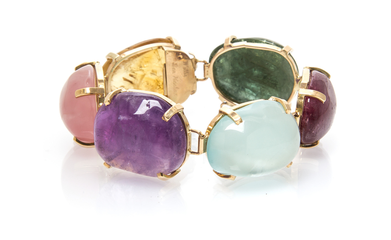 containing oval cabochon cut aquamarine, rose quartz, citrine, amethyst, pink tourmaline and green tourmaline quartz.Stamp: 14K Willis Bar Harbor.