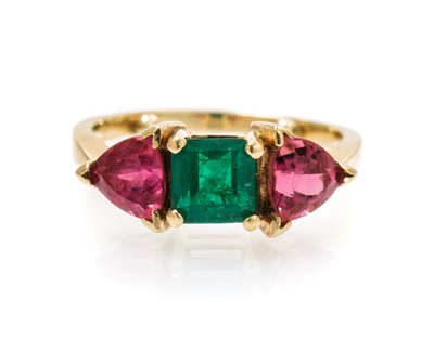 A 14 Karat Yellow Gold, Emerald and Pink Tourmaline Ring,