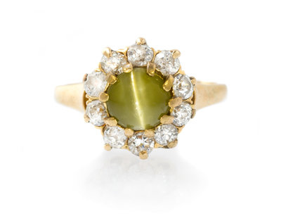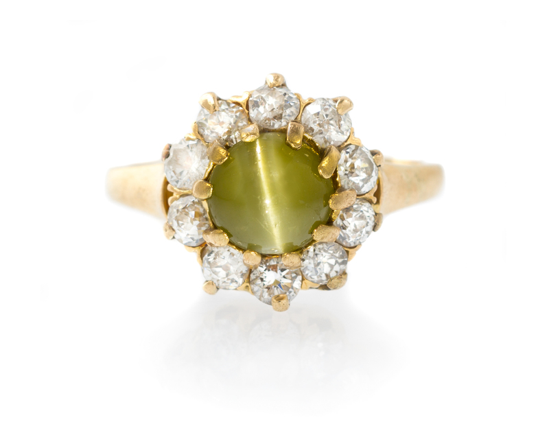 containing one round cabochon cut cat's eye measuring approximately 5.98 x 6.04 x 4.80 mm and 10 old mine and round brilliant cut diamonds weighing approximately 0.70 carat total.