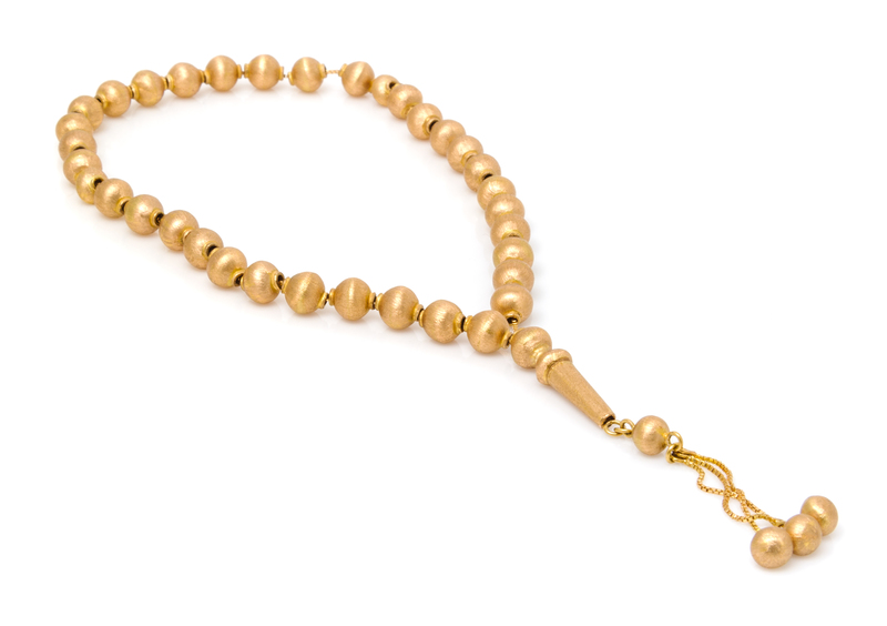 consisting of numerous satin finish beads measuring approximately 6.40-7.60 mm in diameter strung on chain with fringe tassel terminal.