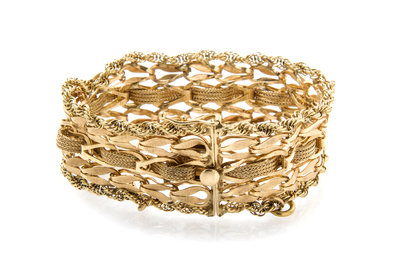 consisting of double twisted links, open textured links and open high polish links with woven gold mesh passing through central links and edged with twisted rope chain. Stamp: 14K.
