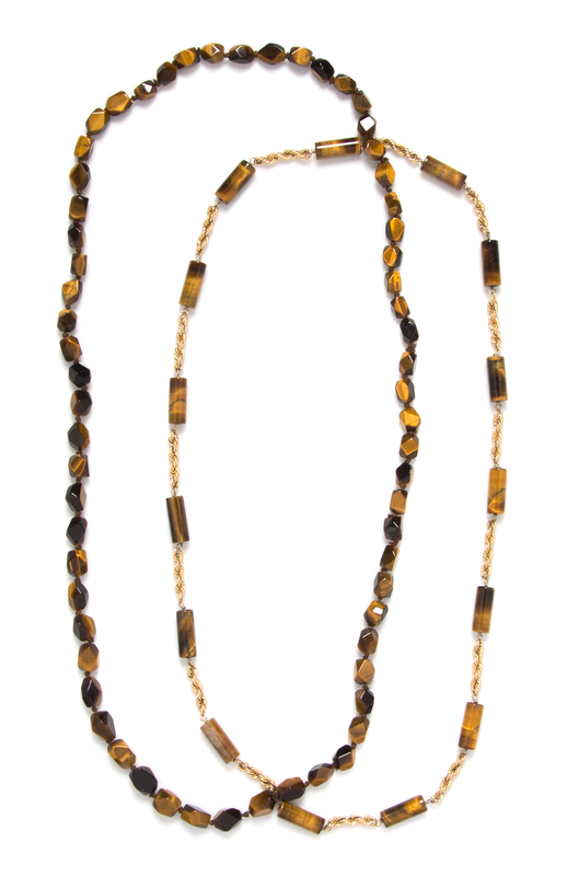 A Collection of Yellow Gold and Tiger's Eye Necklaces,