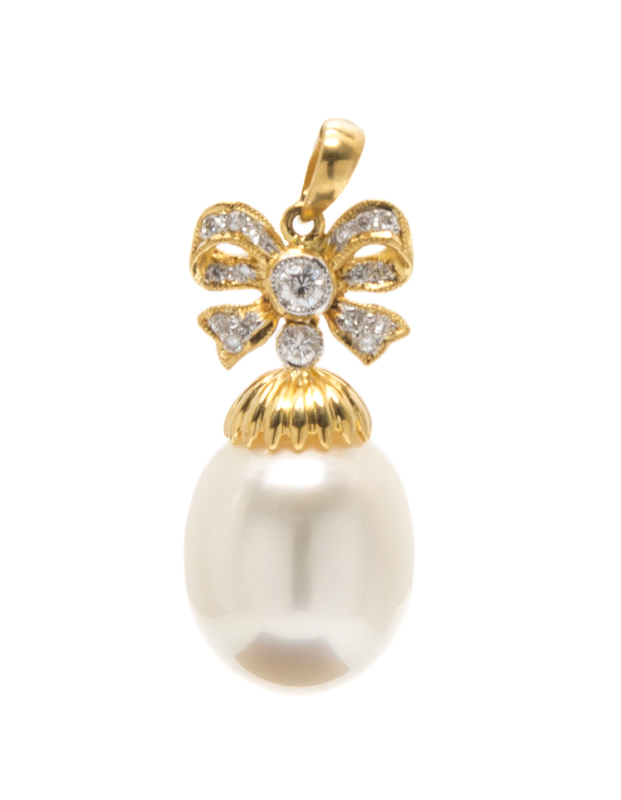 composed of a yellow gold bow containing 18 round brilliant cut diamonds weighing approximately 0.25 carat total suspending one oval shape pearl measuring approximately 15.70 x 13.40 mm.Stamp: 750 (partially obscured).