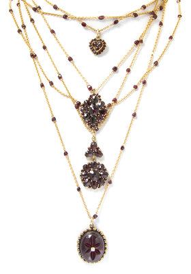 consisting of six cable link chains interspersed at regular intervals with faceted garnet beads, four of the chains supporting pendants including one carved oval cabochon cut garnet inset with one round brilliant cut diamond weighing approximately 0.07 carat within a beaded surround and glazed reverse, two pendants set with round and oval rose cut garnets, and one heart shape cluster pendant set with round rose cut garnets. Stamp: (French gold assay marks).
