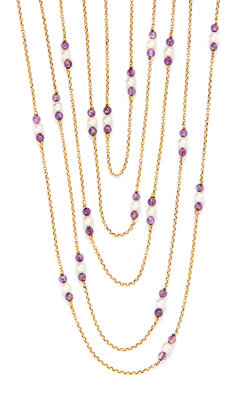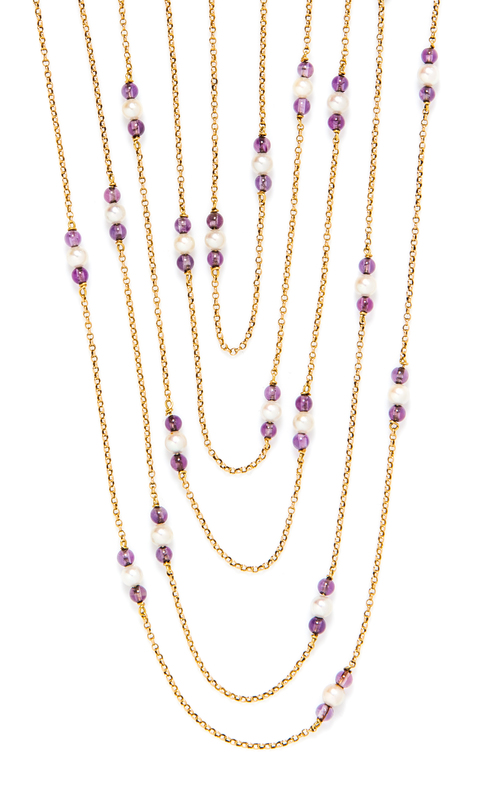 An 18 Karat Yellow Gold, Cultured Pearl and Amethyst Bead Longchain,