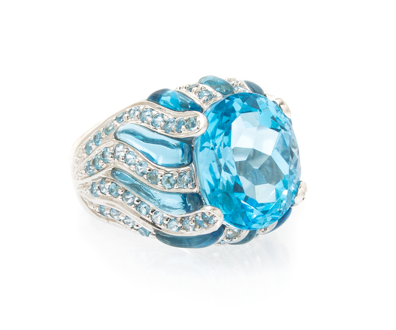 containing one oval mixed cut blue topaz measuring approximately 13.67 x 11.71 x 7.70 mm, numerous round mixed cut topaz and 10 carved free form topaz.Stamp: 18K 750.