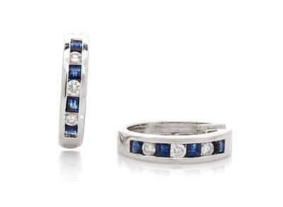 in a hoop style, containing six round brilliant cut diamonds weighing 0.34 carat total alternating with eight square step cut sapphires.Stamp: 14K 585.