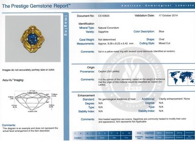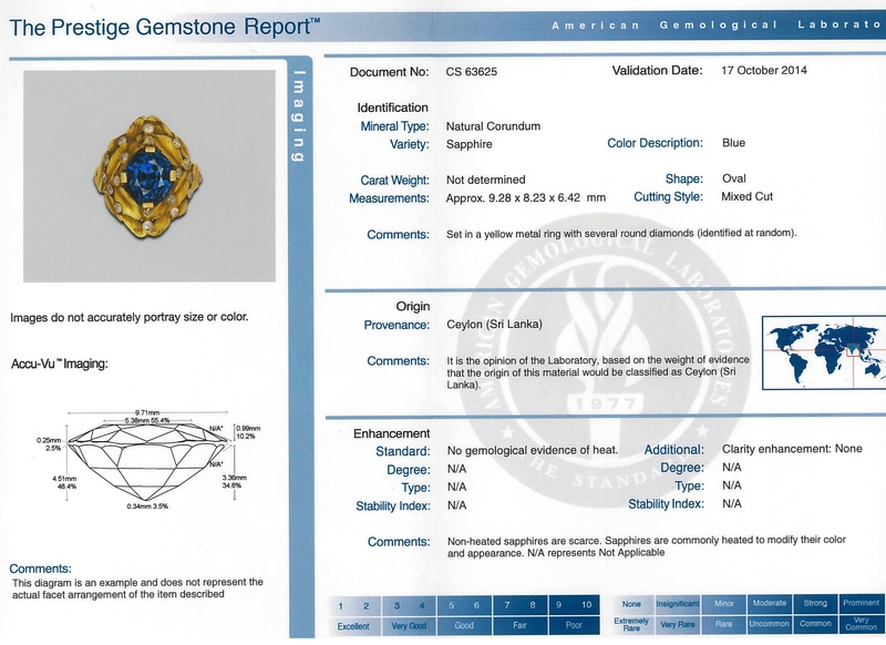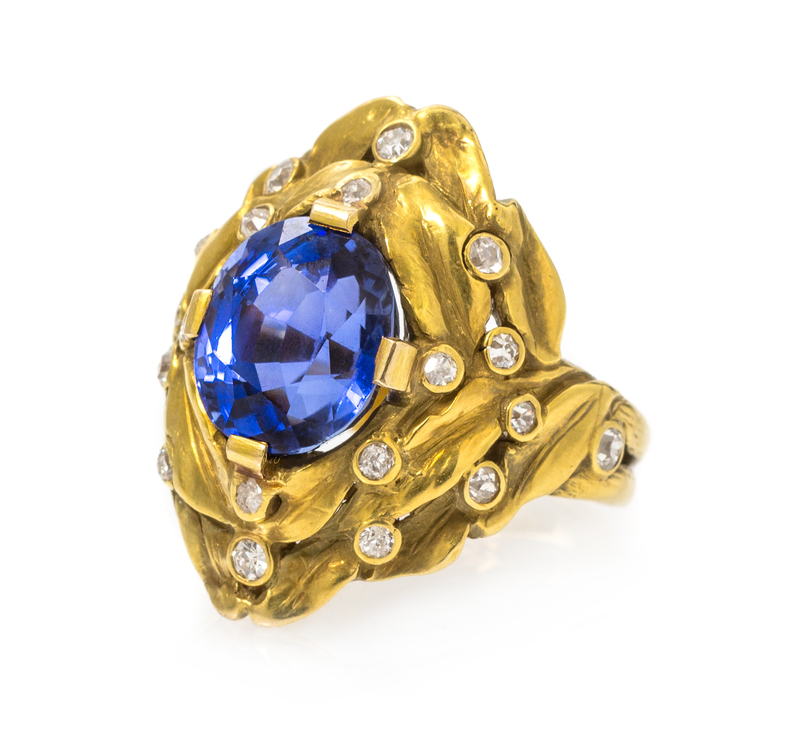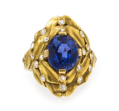 in a stylized layered foliate motif, the sculpted gold setting containing one oval mixed cut sapphire measuring approximately 9.28 x 8.23 x 6.42 mm and 20 old European and old single cut diamonds weighing approximately 0.32 carat total, the underside intricately engraved in a foliate design, split shank.Stamp: (Maker's mark depicting a stylized Y within a circular border).Hand inscribed: No. 1458.Accompanied by an American Gemological Laboratories sapphire identification and origin certificate number CS 63625, dated October 17, 2014, stating Origin: Ceylon (Sri Lanka), Enhancement: No gemological evidence of heat, Clarity Enhancement: None.