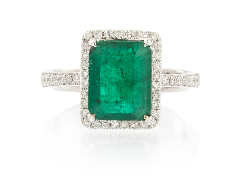 containing one octagonal step cut emerald weighing approximately 2.77 carats and 46 round brilliant cut diamonds weighing approximately 0.38 carat total.Stamp: 2.77 ct 14K CJ.