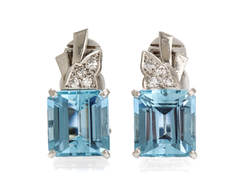 containing two rectangular step cut aquamarines measuring approximately 9.76-10.00 x 9.18-9.23 mm and eight single cut diamonds weighing approximately 0.12 carat total.