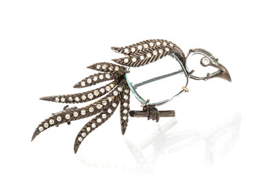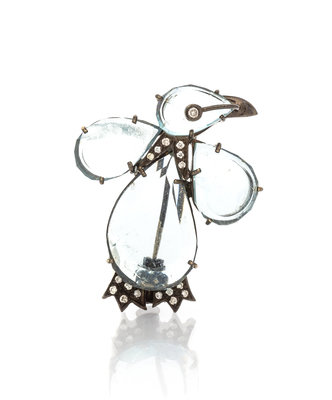 consisting of a black rhodium plated gold perched bird motif brooch containing one pear shape and one cushion shape aquamarine plaque within textured gold wirework setting containing numerous round brilliant cut diamonds weighing approximately 0.55 carat total, together with a similar penguin motif brooch containing four pear shape aquamarine plaques within a wirework setting accented with 16 round brilliant cut diamonds weighing approximately 0.12 carat total.Stamp: 750.